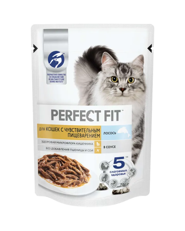 Корм для взрослых кошек PerfectFit с чувствительным пищеварением с лососем в соусе 75г