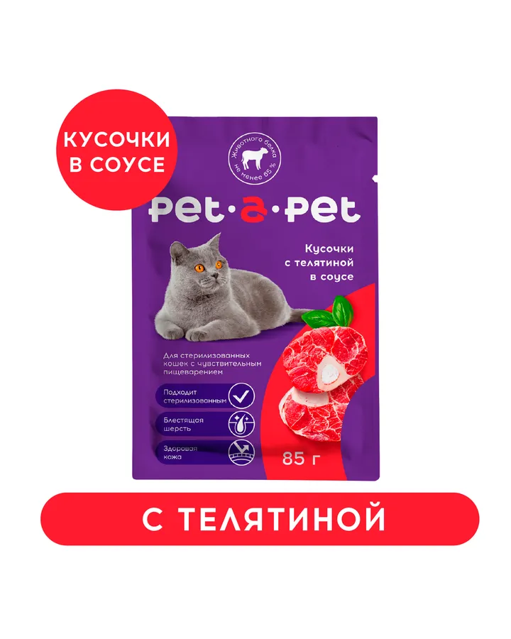 Корм для кошек Pet-a-Pet 85г стерилизованных Кусочки с телятиной в соусе
