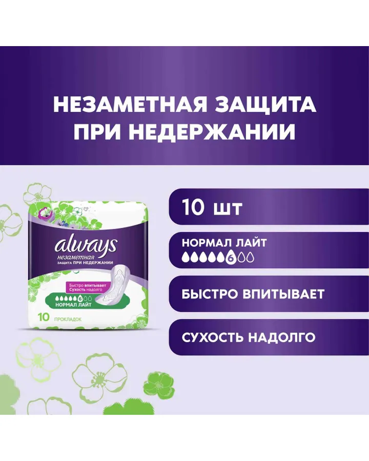 Прокладки при недержании ALWAYS Незаметная защита Нормал Лайт 10шт