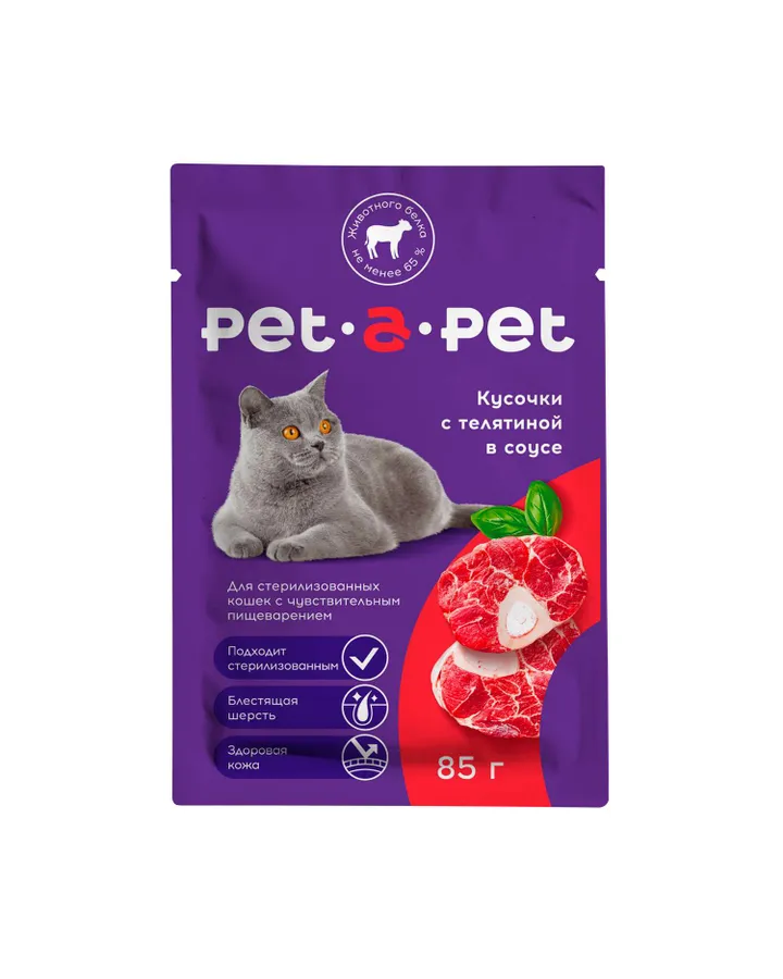 Корм для кошек Pet-a-Pet 85г стерилизованных Кусочки с телятиной в соусе