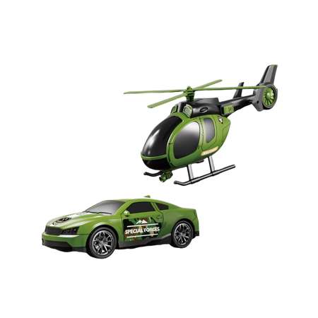 Увлекательный набор для активной игры, в который входят зелёный вертолёт и автомобиль. Техника выполнена в едином стиле и цвете, что делает игру ещё более интересной и реалистичной. Ребёнок сможет придумать множество сюжетов: спасательные миссии, транспортировку машин или просто весёлые гонки.