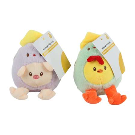Игрушки выполнены из мягкого, приятного на ощупь плюша и наполнены лёгким, упругим материалом, который сохраняет форму даже после долгих объятий. Каждый персонаж имеет свой уникальный костюм — например, свинка в шапочке или цыплёнок в забавном комбинезоне.
