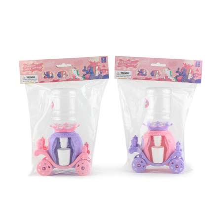 Игрушка мини-кулер выполнен в виде яркой сказочной кареты и предназначен для увлекательной ролевой игры. Конструкция включает прозрачную съёмную «бутыль» и мини-диспенсер внутри кареты, имитируя настоящий кулер для воды. Игрушка украшена декоративными элементами — изогнутыми колесами, «фонарями» по бокам и короной на верхней части, что делает её особенно привлекательной для детей.