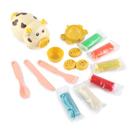 Интересная и познавательная игрушка для творчества, которая позволяет ребёнку создавать фигурки и забавные формы из мягкого пластичного материала. В комплект входит фигурка-коровка с отверстиями для выдавливания массы, формочки, мисочки, а также набор инструментов: нож, ложка, вилка. Дополнительно прилагаются разноцветные бруски пластилина, упакованные отдельно.