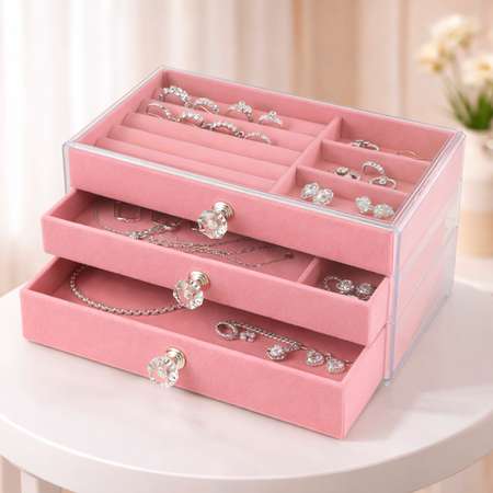 Элегантная шкатулка для украшений с кристаллами — это сочетание роскоши, функциональности и практичности. Идеально подойдет для хранения колец, серег, браслетов и других драгоценностей, обеспечивая их надежную защиту и удобный доступ. Шкатулка выполнена в двух нежных цветах — розовом и сером — и оснащена тремя вместительными выдвижными ящиками с мягким бархатным покрытием, которое бережно оберегает украшения от царапин. Каждый ящик закрывается на изящную ручку-кнопку с имитацией кристалла, придающую изделию шикарный и утонченный вид. Прозрачные верхние крышки позволяют быстро находить нужное украшение без необходимости открывать все ящики. Эта шкатулка станет не только полезным аксессуаром, но и стильным элементом интерьера, а также идеальным подарком для любой женщины, ценящей красоту и порядок.