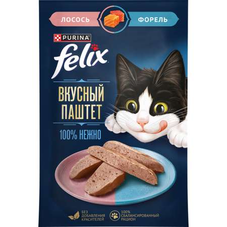 FELIX Вкусный паштет – это невероятно нежная текстура и аппетитное сочетание вкусов! Радуйте Вашего любимца разнообразием каждый день вместе с FELIX. 100% сбалансированный рацион Источник Омега-6 жирных кислот Содержит витамины Д и Е Посмотри, какой нежный! Рекомендации по кормлению : Для взрослой кошки среднего веса (4 кг) рекомендуется 3-4 пакетика в день. Кормление желательно разделить минимум на два приема. Данные значения рассчитаны для кошек с умеренной активностью при нормальной температуре окружающей среды. Индивидуальные потребности кошки могут варьироваться, и ежедневное количество корма должно быть скорректировано по мере необходимости для поддержания оптимального веса Вашей кошки. Подавайте корм комнатной температуры. Следите, чтобы у Вашей кошки всегда была чистая, свежая питьевая вода.