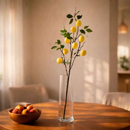 Эта декоративная ветка с лимонами станет ярким и стильным акцентом в вашем интерьере. Изделие выполнено в виде реалистичной ветви с сочными желтыми плодами и насыщенно-зелеными листьями на темных изящных побегах. Ветка украшена семью объемными лимонами натурального оттенка, которые выглядят максимально естественно и аппетитно. Такой декоративный элемент прекрасно подойдет для создания средиземноморской, прованской или современной стилистики в доме, офисе, кафе или ресторане. Ветку можно использовать как самостоятельный аксессуар в вазе, так и в составе сложных флористических композиций. Изделие не требует специального ухода, не вянет и сохраняет свой привлекательный вид на протяжении многих лет, даря ощущение свежести и летнего настроения в любое время года.