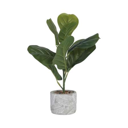 Этот изящный искусственный фикус в стильном кашпо станет идеальным дополнением любого интерьера. Растение с крупными насыщенно-зелёными листьями выглядит максимально естественно и не требует особого ухода – его не нужно поливать, удобрять или искать для него специальное освещение. Декоративный горшок серого цвета с рельефным узором в виде листьев изготовлен из качественного материала, имитирующего камень, что придаёт композиции современный и элегантный вид. На поверхности грунта размещены натуральные декоративные камешки, которые завершают общую картину и добавляют реалистичности. Компактный размер позволяет разместить фикус на подоконнике, столе, полке или комоде – он прекрасно впишется в гостиную, спальню, офис или любое другое помещение. Это отличное решение для тех, кто любит зелень в интерьере, но не имеет времени на уход за живыми растениями. Такой фикус также станет замечательным подарком для близких и коллег.