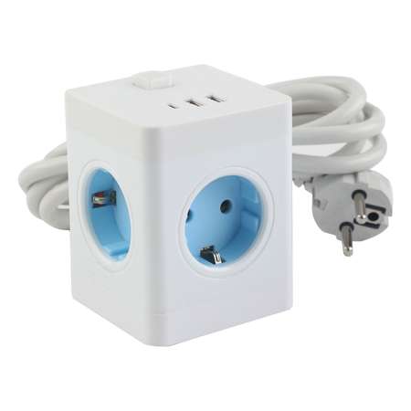 Электрический удлинитель в форме куба на 4 гнезда. Оснащен выключателем, 2 портами USB, и одним type-c. Может использоваться в качестве переходника для подключения электроприборов с недостаточной длиной кабеля.