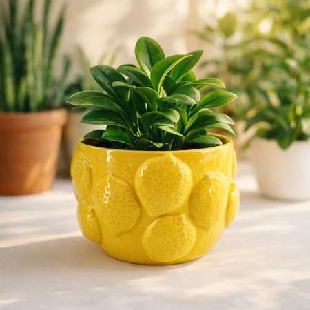 Эта яркая декоративная ваза в форме лимонов станет сочным акцентом в вашем интерьере. Кашпо выполнено из качественной керамики насыщенного жёлтого цвета с глянцевым покрытием, которое придаёт изделию эффектный блеск и лёгкость в уходе. Поверхность вазы украшена объёмным рельефным узором в виде крупных лимонов с детализированной текстурой цитрусовой кожуры, что выглядит очень реалистично и жизнерадостно. Просторная круглая форма позволяет использовать вазу как для посадки комнатных растений, так и в качестве самостоятельного декоративного элемента – например, для хранения фруктов на кухне или как стильную подставку для различных мелочей. Глубокий жёлтый цвет символизирует энергию, радость и позитив, создавая тёплую атмосферу в помещении. Такая ваза прекрасно дополнит интерьер кухни, гостиной, столовой или веранды в средиземноморском, современном или скандинавском стиле. Это также замечательная идея для оригинального подарка любителям цитрусовых тем и яркого декора.