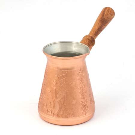 Кофеварка изготовлена из экологически чистой и высококачественной меди марки М1М. Внутренняя поверхность кофеварки покрыта двойным слоем пищевого олова, а внешняя – жаростойким прозрачным лаком. Это противодействует окислению (потемнению) и приятно радует глаз цветом настоящей меди.