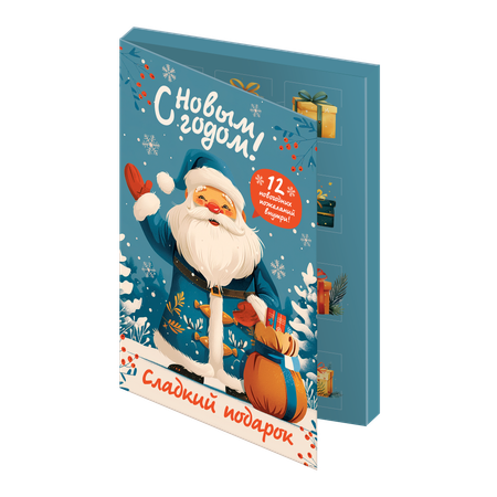 Волшебство нового года в новогодней открытке с праздничными пожеланиями и сладкими подарками. Внутри — 12 фигурок из нежной глазури в форме плоских кружочков, каждая спрятана за волшебным окошечком. Откройте окошко — и вас встретит не только сладкий сюрприз, но и теплое новогоднее пожелание на обратной стороне.