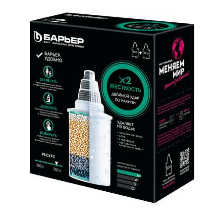 Комплект из 2 сменных кассет для фильтра БАРЬЕР Жесткость Х2. Специализированная очистка очень жесткой городской воды. Улучшенный состав засыпки позволяет менять кассету реже и дольше наслаждаться водой без накипи. Как и другие кассеты БАРЬЕР, Жесткость Х2 также удаляет хлор и его побочные продукты, тяжелые металлы, посторонние запахи и привкусы. Ресурс каждой кассеты — 350 литров.