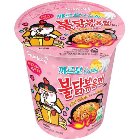 Лапша быстрого приготовления сублимированная «Samyang» со вкусом курицы и соуса карбонара, острая Hot chicken flavor ramen Carbo Масса нетто: 80 г Изготовитель: Samyang Foods Co., Ltd 104, Opaesan-ro-3-gil, Seongbuk-gu, Seoul, Korea (104, Опесан-Ро 3 Гил, Сонг-бук Ку, Сеул, Республика Корея)