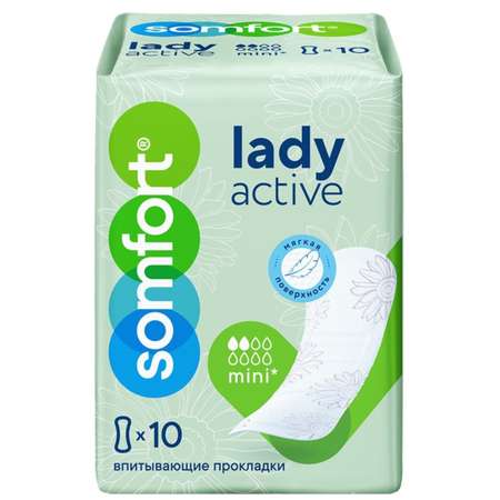 Somfort Lady Active — мягкие впитывающие прокладки, обеспечивающие тройную защиту от протеканий, влаги и запаха.Somfort Lady Active Mini (Сомфорт Леди Актив Мини) — компактные впитывающие прокладки, созданные для защиты при недержании легкой (капельной) степени. Благодаря гранулам суперабсорбента в составе впитывающего слоя быстро поглощают влагу, удерживая ее внутри прокладки, и нейтрализуют запах. Мягкая поверхность дарит ощущение комфорта.Быстро впитывают и надолго обеспечивают сухостьКомпактный размер как у обычной гигиенической прокладки. Надежно удерживают влагу благодаря впитывающему слою с суперабсорбентом. Мягкая поверхность дарит комфорт и заботу о коже. Нейтрализуют нежелательный запах. Без ароматизаторов и отдушек. Не содержат латекса. Каждая прокладка в индивидуальной упаковке.Впитываемость: 2 капли