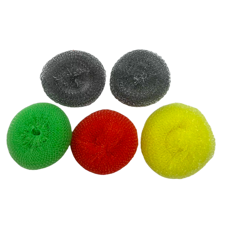 Практичный набор круглых губок на каждый день: для деликатной чистки и для стойких загрязнений. В комплекте 5 штук – 2 металлические губки и 3 губки из сетчатого полипропилена.