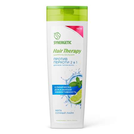 Шампунь-бальзам SYNERGETIC Против перхоти 2 в 1 HAIR THERAPY эффективно очищает и ухаживает за волосами и кожей головы. Активный компонент пропандиол каприлат устраняет перхоть и предотвращает её появление, не раздражая чувствительную кожу головы. Цинк стабилизирует работу сальных желёз и улучшает состояние кожи головы, оставляя ощущение свежести надолго. Растительные компоненты сахарид изомерат и бетаин способствуют длительному увлажнению и смягчению кожи головы, улучшая её состояние. Сок лайма, мята и протеины пшеницы укрепляют волосы и восстанавливают их структуру, улучшая внешний вид. Мультифункциональный компонент натурального происхождения софоролипид мягко очищает и сохраняет естественный микробиом кожи. Инновационный увлажняющий комплекс усиливает барьерные свойства кожи за счёт глубокого увлажнения до 72 часов. Физиологичный уровень pH 5,5 способствует устранению сухости кожи головы и гарантирует безопасность при частом использовании средства даже для чувствительной кожи. Эффективность шампуня при регулярном использовании подтверждена аккредитованным испытательным центром.