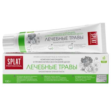 Зубная паста SPLAT Professional «Лечебные травы» комплексно ухаживает за зубами и чувствительными деснами, снижает их кровоточивость и болезненные ощущения в полости рта. Экстракты ромашки, шалфея и боярышника оказывают антибактериальное и противовоспалительное действие. Эфирное масло герани - природный антисептик. Экстракт облепихи способствует заживлению мягких тканей. Лактат кальция в сочетании фторид-ионами укрепляют эмаль, делают ее устойчивой к воздействию кислот.